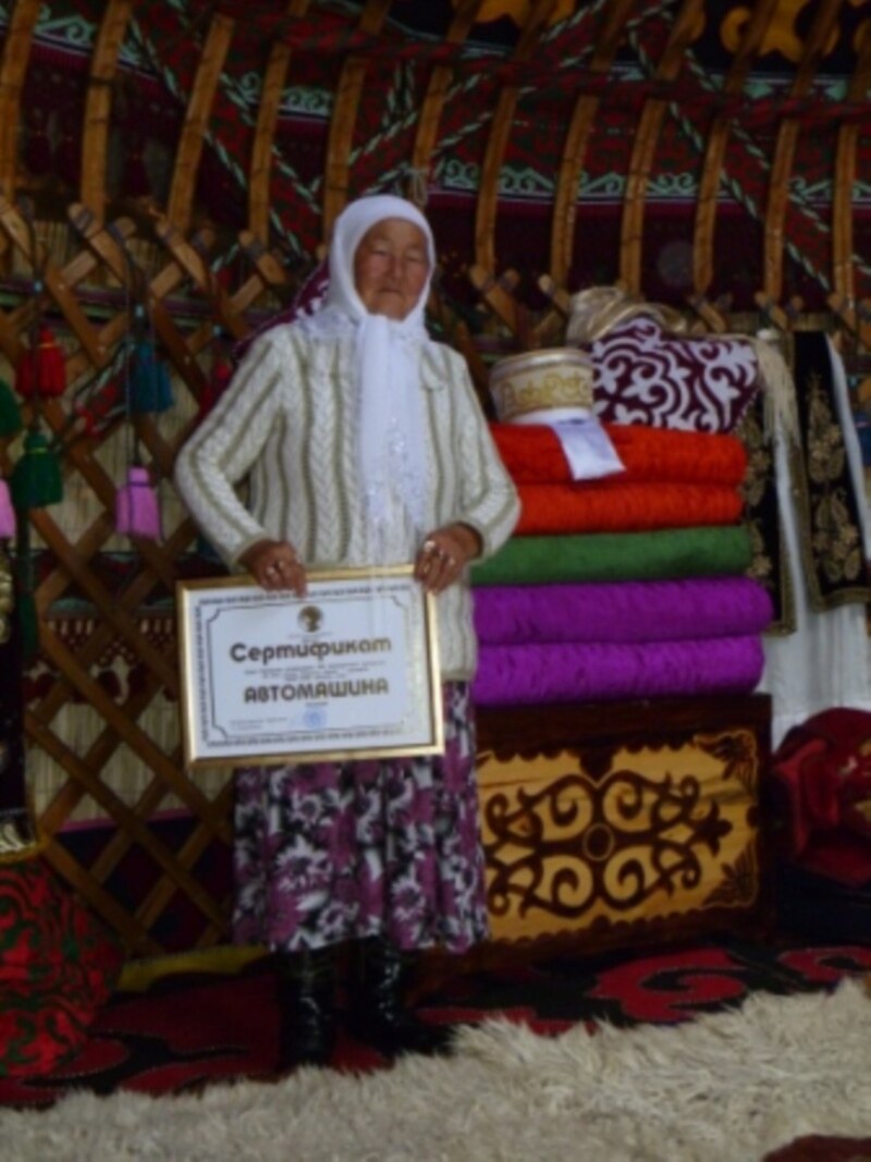 9 күйөө балам бар, ошолордун баары боз үй жасайт. Азыркыча айтканда бизнес кылабыз. Илгертеден ата-бабадан калган боз үй жасоону баш көз болуп баарын үйрөтүп атам.